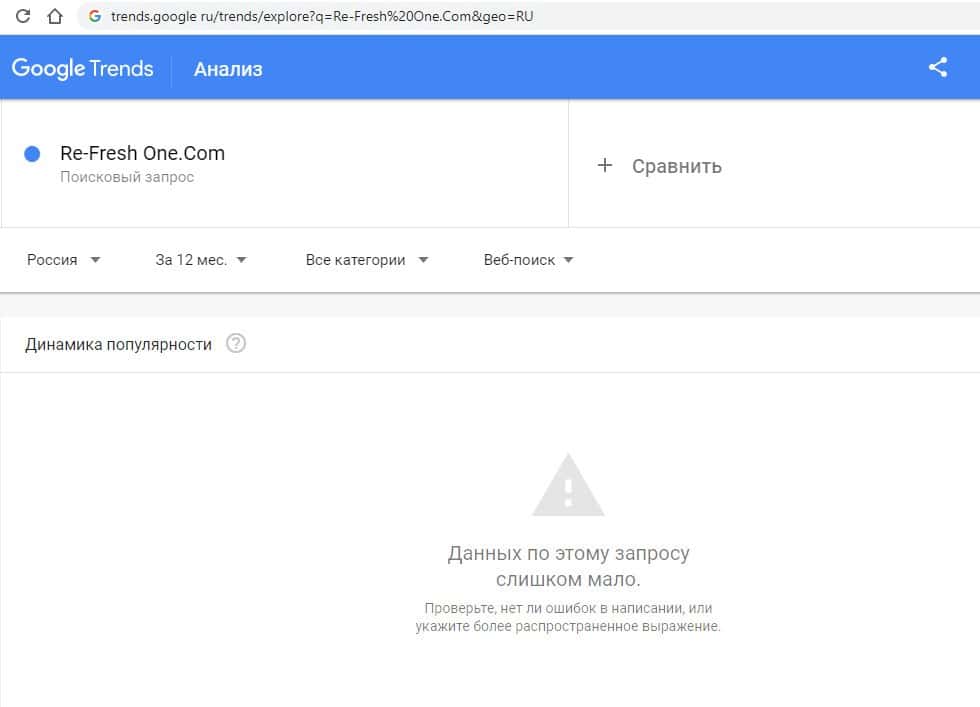 Такой же запрос в Яндекс на английском языке без пробела и с точкой "Re-FreshOne.Com" выдает результат в 0 показов в месяц. так информацию об этих аферистах никто не ищет.