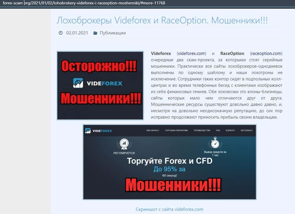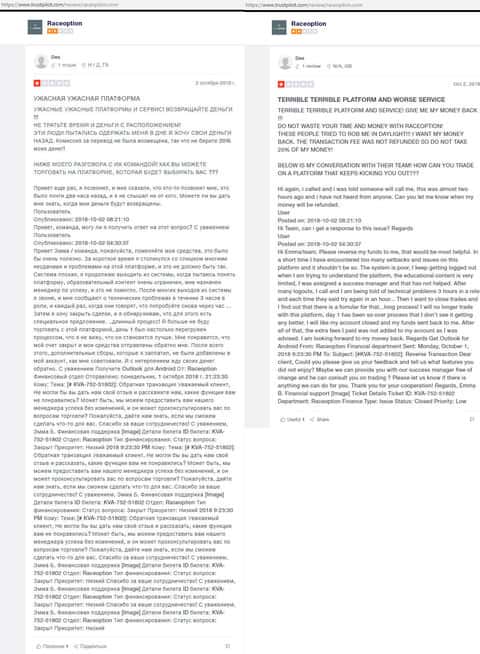 Вот представлен развернутый отзыв от человека, который попался на удочку к жулью Race Option. Он изложил все подробности развода: как ведет себя звонарь, что он говорит, на что ловит своих новичков-клиентов, а также проблемы с торговой платформой, которые возникают в процесс торговли. Все эти вводные данные ведут к сливу депозита клиента, а также трудно потом оспорить в суде.