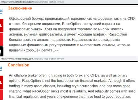 На одном из веб-портале нам удалось найти статью, где описана деятельность конторы Рэйс Опцион. Всю мы представлять не будем, а лишь прокомментируем заключение. По их мнению Race Option - не лучший вариант на финансовых рынках, хоть там и есть какие-то плюсы. Все же это оффшорный брокер, который в любой момент может схлопнуться и сбежать с вашими деньгами.
