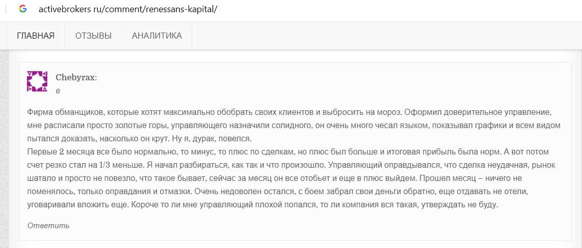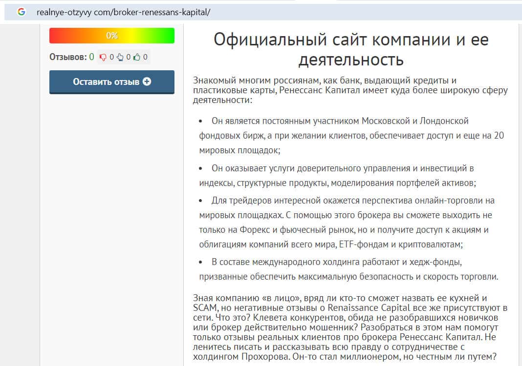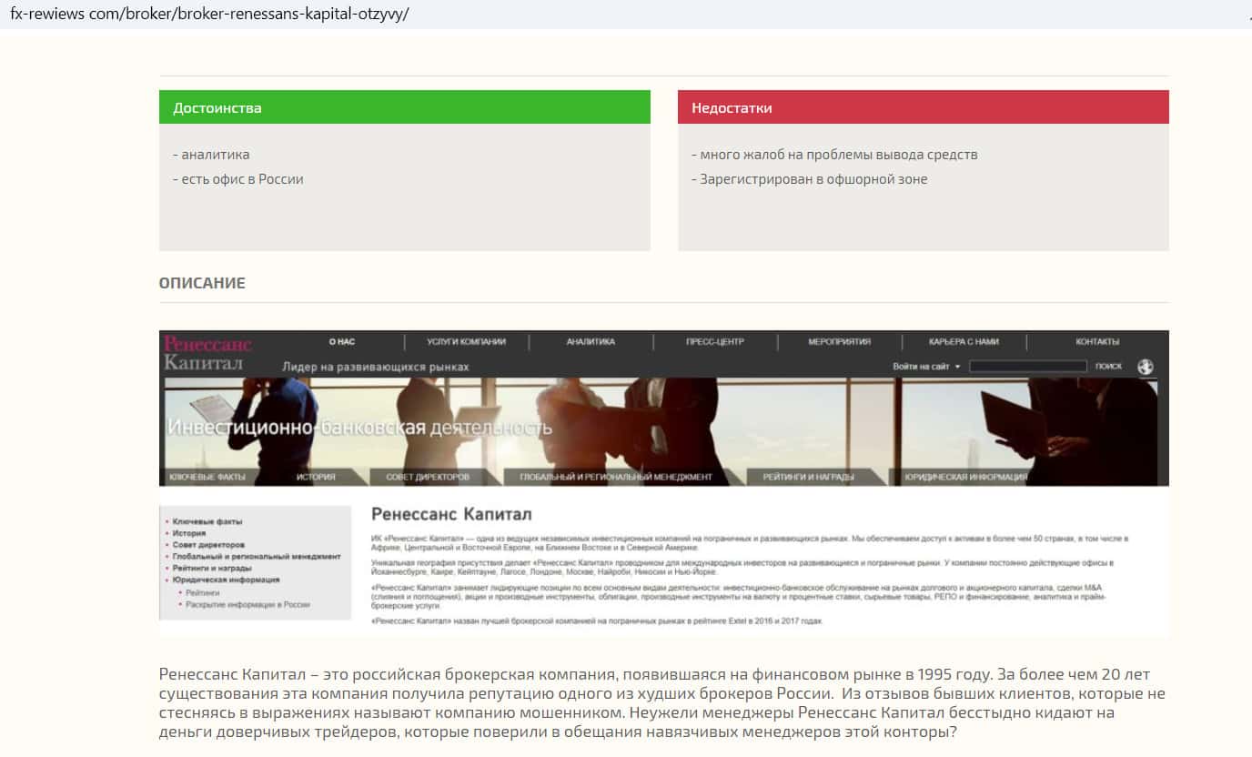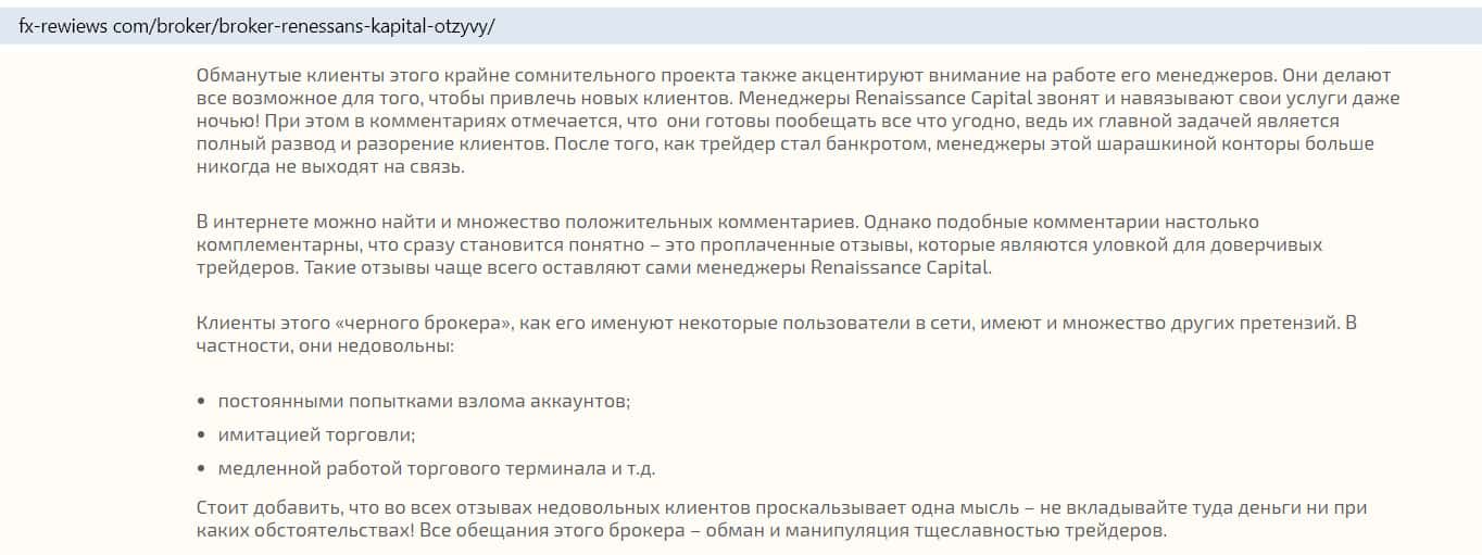 Компания Ренессанс Капитал имеет репутацию одного из худших брокеров России: информация на сайте fx-rewiews com