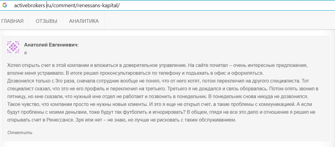 Многие люди недовольны обслуживанием в конторе Renaissance Capital. Анатолий Евгеньевич описал, как относятся эти жулики к клиентам. Сначала он не мог дозвониться в офис, потом его долго отправляли от менеджера к менеджеру, в итоге связь оборвалась. Мужчина пытался связаться с офисом еще несколько раз, но так и не смог. Он сделал вывод, что не стоит начинать работать с такими безответственными людьми.