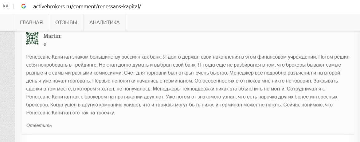 Молодой человек оставил свой комментарий по поводу работы с Ренессанс Капитал на сайте activebrokers ru. Он выбрал именно эту площадку для трейдинга, потому что у него был вклад в этом банке. Но, когда мужчина начал торговать с указанным брокером, он увидел, что тот имеет множество недостатков, главный из которых - плохая работа терминала. После двух лет сотрудничества он решил поискать более надежного брокера.
