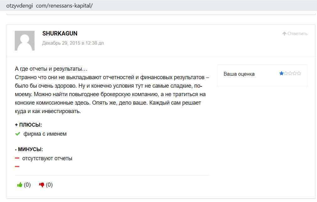 Еще один отзыв на сайте Отзывденьги говорит о том, что контора Ренессанс Капитал подозрительная. Например, сомнения вызывает то, что отсутствует отчетность их деятельности в биржевой торговле. Если все так хорошо, почему нет результатов? Опять же, высокая комиссия за сделки, можно найти брокера и получше.