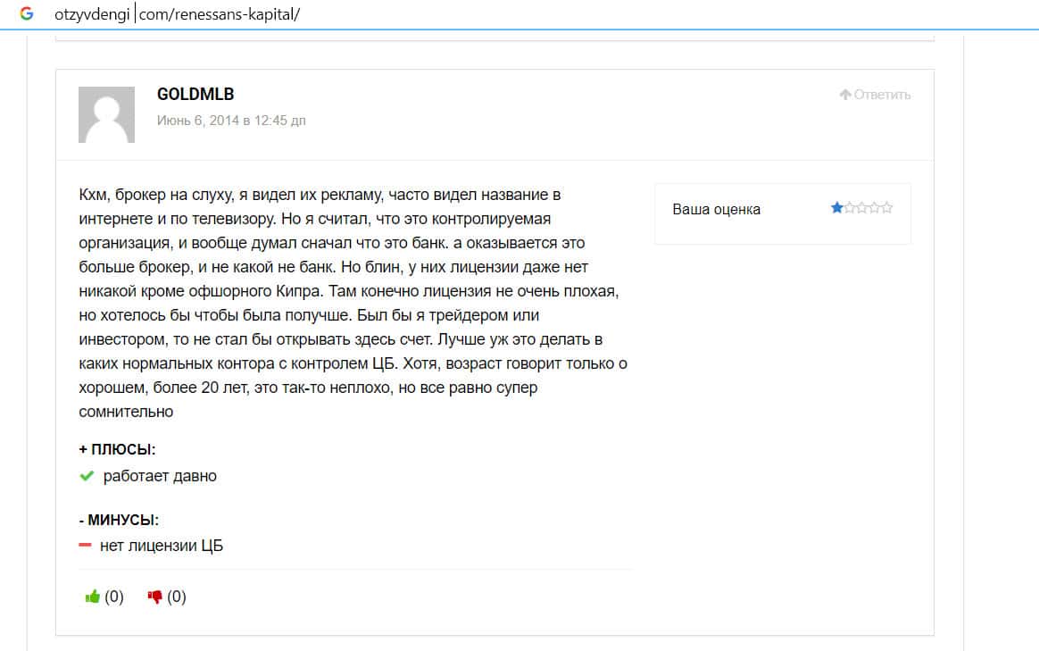 Пользователь с ником Goldmlb пишет, что компания Renaissance Capital хорошо распиарена, их название у всех на слуху, но по факту это темная лошадка. Это известный банк, работающий в России около 20 лет. Однако, брокер не имеет лицензии ЦБ РФ, поэтому не регулируется российскими финансовыми организациями. Лучше не иметь с ним дела, поскольку это очень сомнительно.