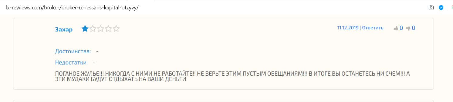 На сайте fx-rewiews com, который опубликовал разоблачающую статью про жуликов из Renaissance Capital, тут же появилось множество отзывов от людей, которых обманули эти наглые кидалы. Один из них, Захар, призывает никогда не связываться с этой конторой, которая развела его на деньги. Мошенники только раздают пустые обещания, а потом забирают средства с ваших счетов.