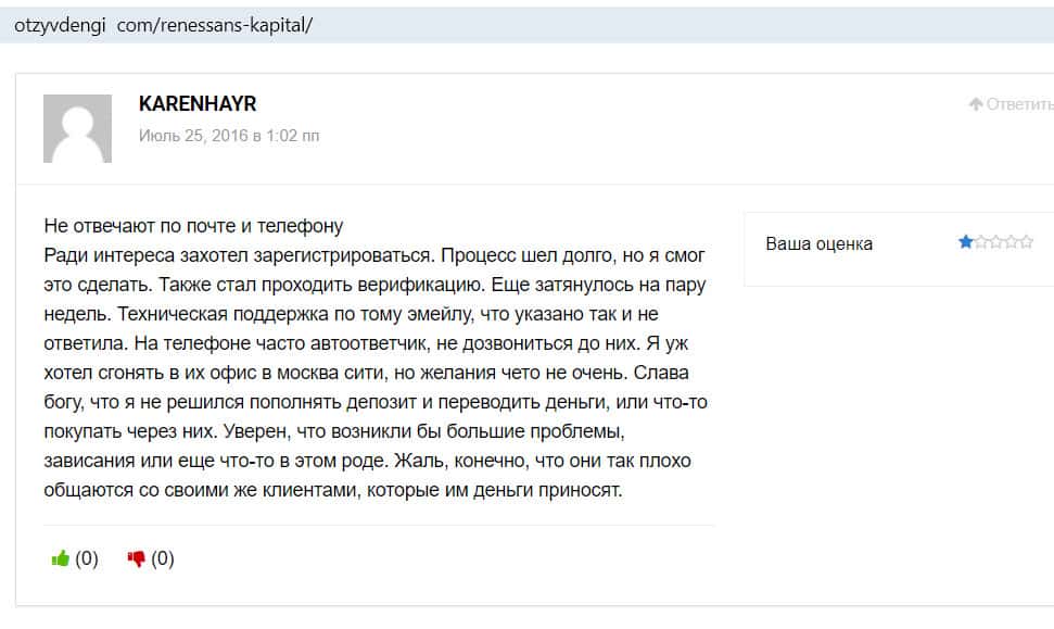 Мнение пользователей: клиентское обслуживание в конторе Ренессанс Капитал никуда не годится