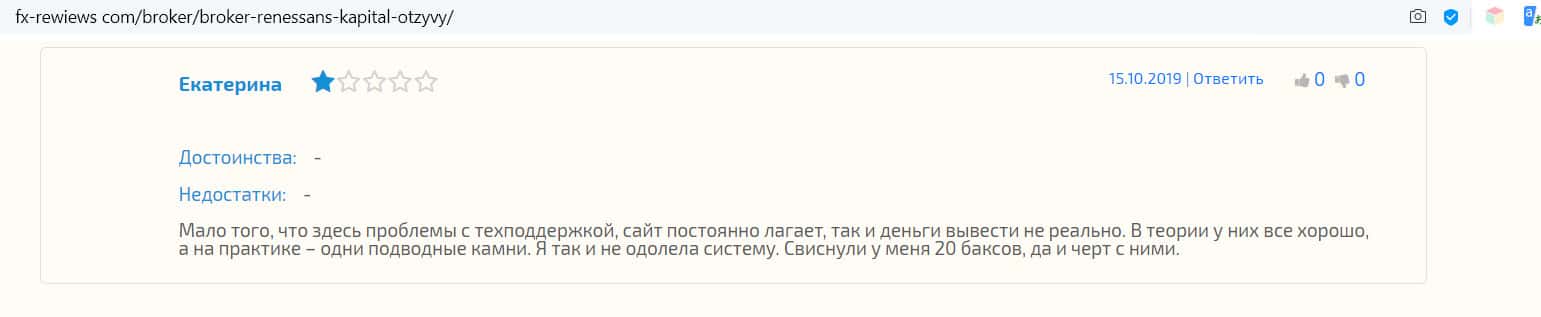 Екатерина написала на сайт fx-rewiews com о своих проблемах с конторой Ренессанс Капитал. Девушка говорит, что все хорошо только в теории, но на практике много подводных камней. Постоянно глючит терминал, не давая трейдеру закрыть сделки в нужный момент, и с техподдержкой постоянные проблемы. Вдобавок Екатерина не смогла вывести свои деньги и в результате махнула рукой на этих жуликов.