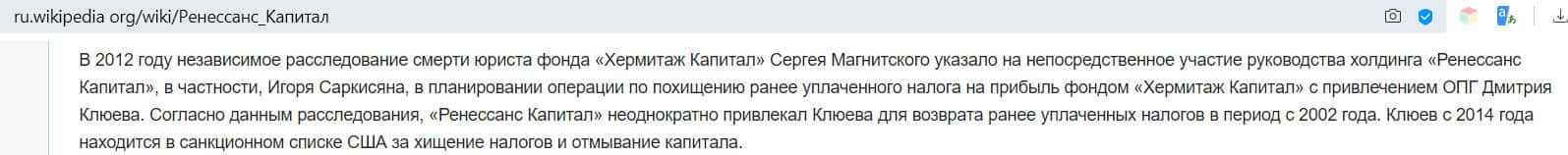 В Википедии, которая является независимым ресурсом, собирающим информацию обо всех и вся, можно найти очень интересные факты о компании Renaissance Capital. Оказывается, ее сотрудники были замечены в похищении денег и отмывании капитала организации. Один из них находится в санкционном списке США вот уже несколько лет. О каком честном трейдинге на данном ресурсе после этого может идти речь?