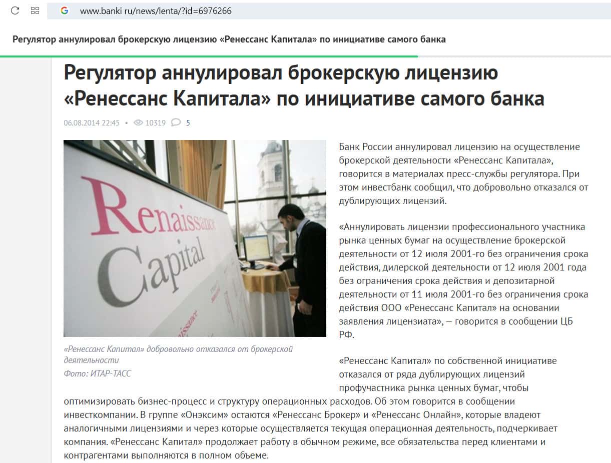 В 2014 году на сайте Банкиру появилась статья о том, что банк России аннулировал брокерскую лицензию компании Ренессанс Капитал. Это было сделано по заявлению самой организации. Такие действия объяснялись тем, что Ренессанс оптимизирует бизнес-процессы внутри структуры. По факту, мы имеем брокера, который не имеет право осуществлять данный вид деятельности.