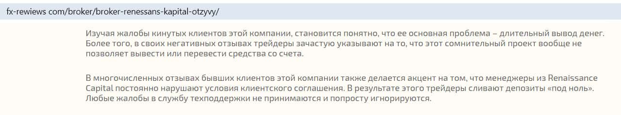Сайт fx-rewiews com в своем обзоре о конторе Ренессанс Капитал указывает на наличие в сети большого количества отзывов негативного содержания. В основном люди жалуются на проблемы с выводом средств. Бывшие клиенты прямо называют эту организацию мошеннической, в связи с чем она заслужила репутацию чуть ли не самого худшего российского брокера.