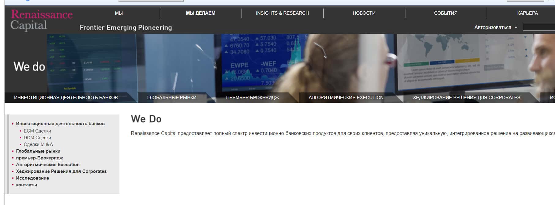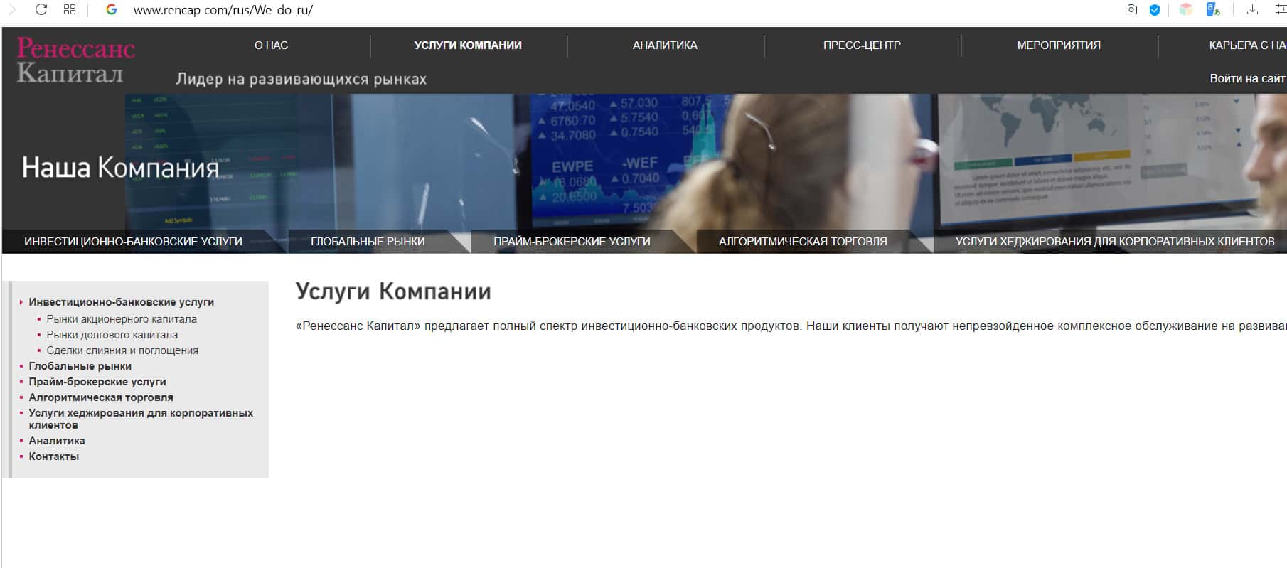Сайт компании Ренессанс Капитал выглядит также, как и большинство подобных брокерских организаций