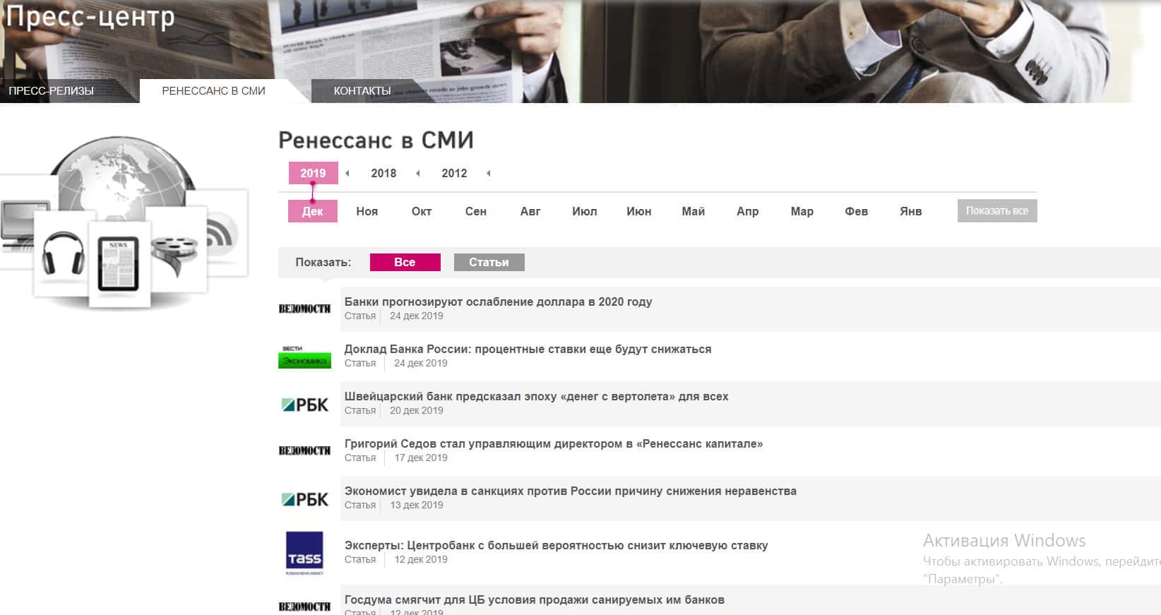 Ресурс компании Ренессанс Капитал имеет несколько интересных разделов, например: Пресс-центр, Мероприятия, Новости. Но ничего особенного там нет, обычные пустые фразы и сообщения о том, что фирма организует разные ивенты. На вкладке Ренессанс в СМИ выложены новостные статьи о компании и финансовую тематику.