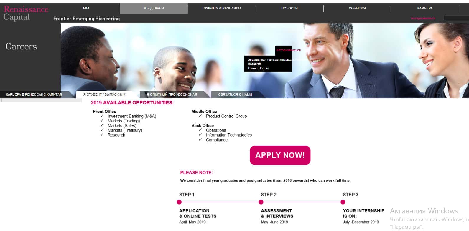 Мошенники из Ренессанс Капитал предлагают всем желающим пройти оплачиваемую стажировку в их чудесной компании (раздел Карьера). Видимо, там учат, как лучше обманывать людей и разводить на деньги. Причем при переводе на русский язык основная часть текста остается на английском. Наверное, данная страница ориентирована на афроамериканцев, фото с которыми стоит на банере.