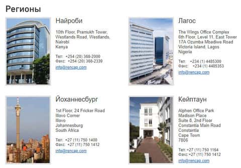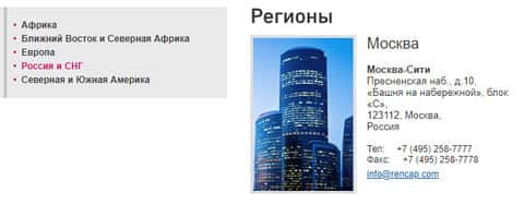 По поводу контактных данных, дилинговая контора Ренессанс Капитал также не поскупилась и для втирания в доверие к своим клиентам, понавыдумывала множество адресов, электронных почт и телефонов по всему миру. Ниже представим все эти данные, дабы предупредить вас о потенциальной опасности: