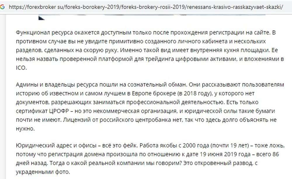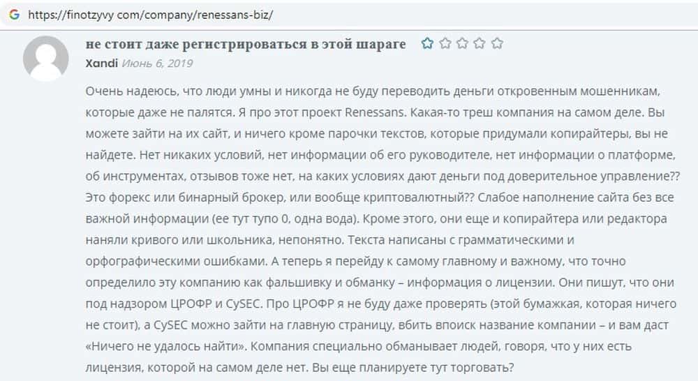 Опытные трейдеры сразу заподозрили, что Ренессанс - не более чем очередная афера. На ресурсе finotzyvy com они делятся своими наблюдениями: информации о платформах и условиях нет, вместо конкретной информации, в основном "вода" и пустые обещания. Фальшивый брокер Renessans кроме них не дает никаких гарантий.