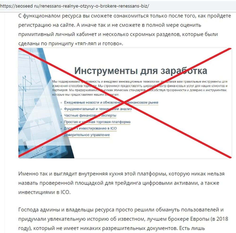 Обзор деятельности кидал Ренессанс на ресурсе seoseed ru неутешителен. Все достижения и партнеры аферистов фейковые. Реальные отзывы говорят о том, что тем немногим трейдерам, которые с ними связались, не удалось ничего заработать. Наоборот, вложенные деньги они теряли. Сам проект сверстан на скорую руку.