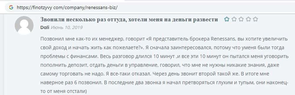 Среди отзывов на портале finotzyvy com есть трейдеры, которым удалось избежать ловушки Renessans. Одному из них аферисты звонили шесть раз, пытаясь развести его на кругленькую сумму. К счастью, познакомившись с конторой, условиями и почитав отзывы, опытный трейдер отказался от убыточного сотрудничества.