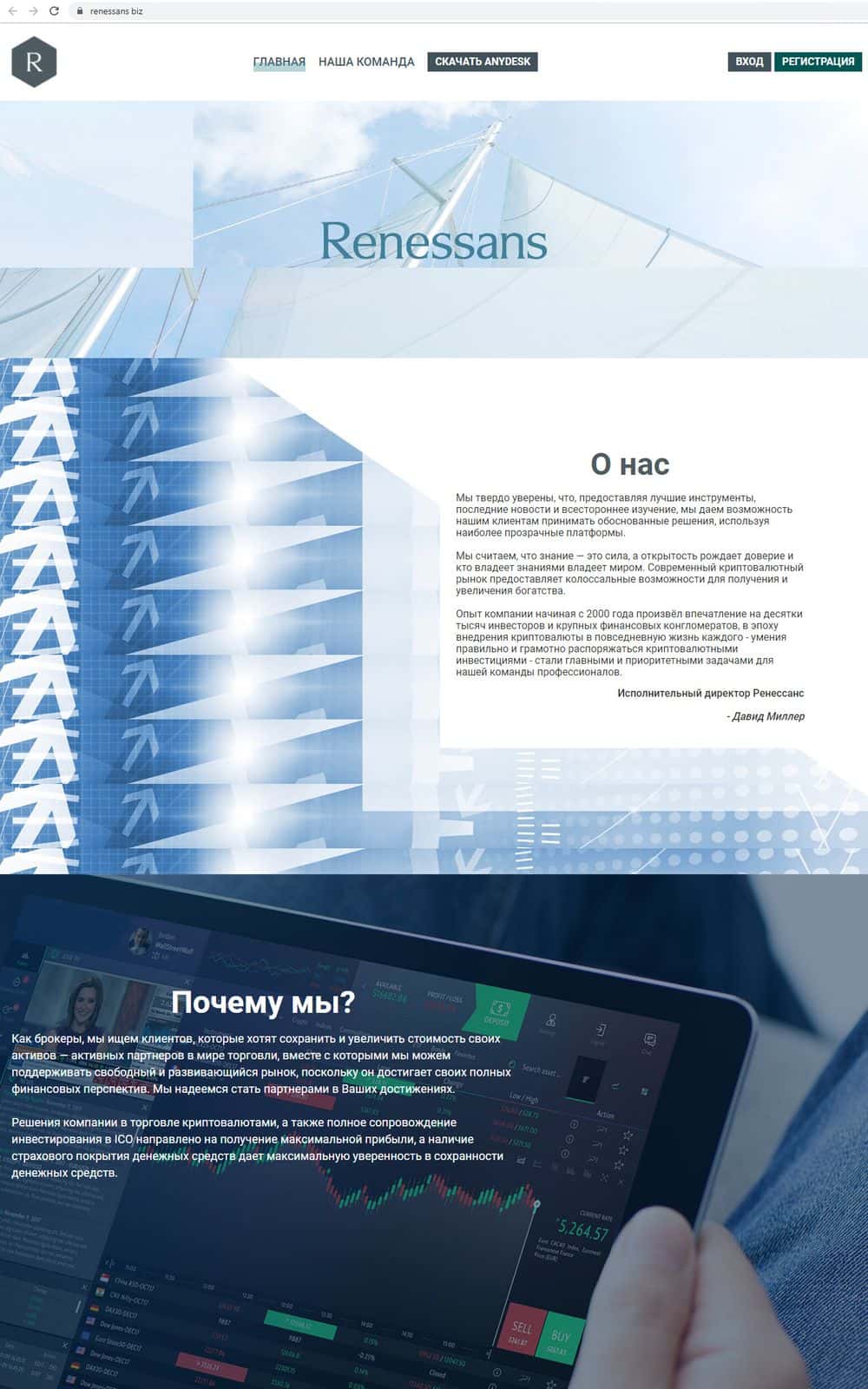 На сайте лохотронщиков Ренессанс на редкость мало информации. На главное рассказана красивая история успешного мирового брокера, который работает уже 19 лет и очень дорожит доверием клиентов. Тем, что подпишется, обещают ежедневные новости, фундаментальный и технический анализ, консультации частных экспертов.