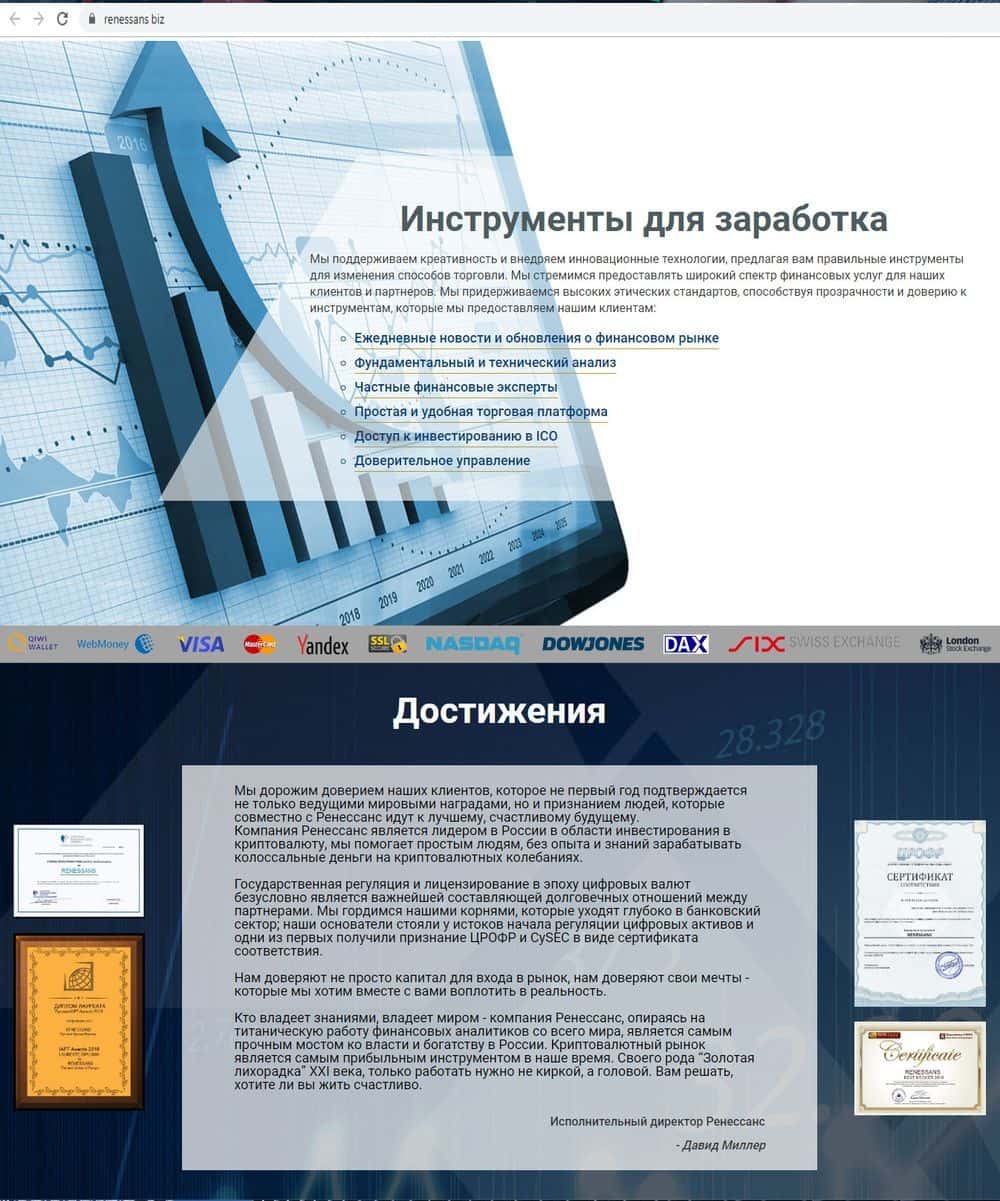 Renessans - фейковый брокер, который начал работу относительно недавно. Деятельность проекта в основном направлена на криптовалютные инвестиции. Аферисты Ренессанс вешают лапшу о том, что им важно доверие клиентов и их главная задача - стабильный доход трейдера. На самом деле их единственная цель - выманить у вас как можно больше денег.