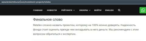 Из данного материала становится известно, что контора Retelex является одним из многих мошеннических проектов в сети интернет. Поэтому доверять свои деньги аферистам не стоит.
