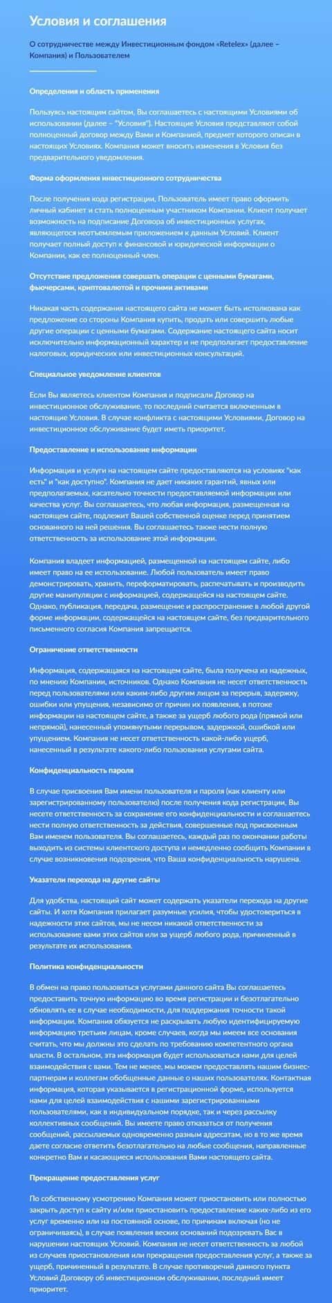 Ниже представлена полная версия клиентского соглашения мошенников Retelex. Там клиент может ознакомиться со всеми подводными камнями, которые будут его ожидать.