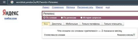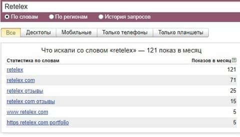 Что касается запроса "retelex.com" так здесь почти такая же ситуация. Всего 71 запрос в месяц выдала поисковая система Яндекс.
