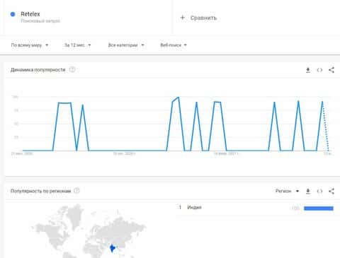 Та же ситуация и с запросом бренда "Retelex", и здесь есть кое-какая популярность, так как Гугл получал запросы в основном из Индии.
