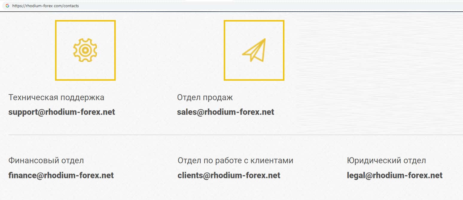 Лохотронщики Рходиум Форекс на своем официальном онлайн-ресурсе указывают несколько адресов электронной почты, а именно: