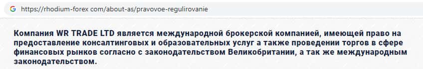 Юридическое лицо WR TRADE LTD владеет мошенническим сервисом rhodium-forex com, главная цель которого, отъем денег у доверчивой части онлайн-сообщества.