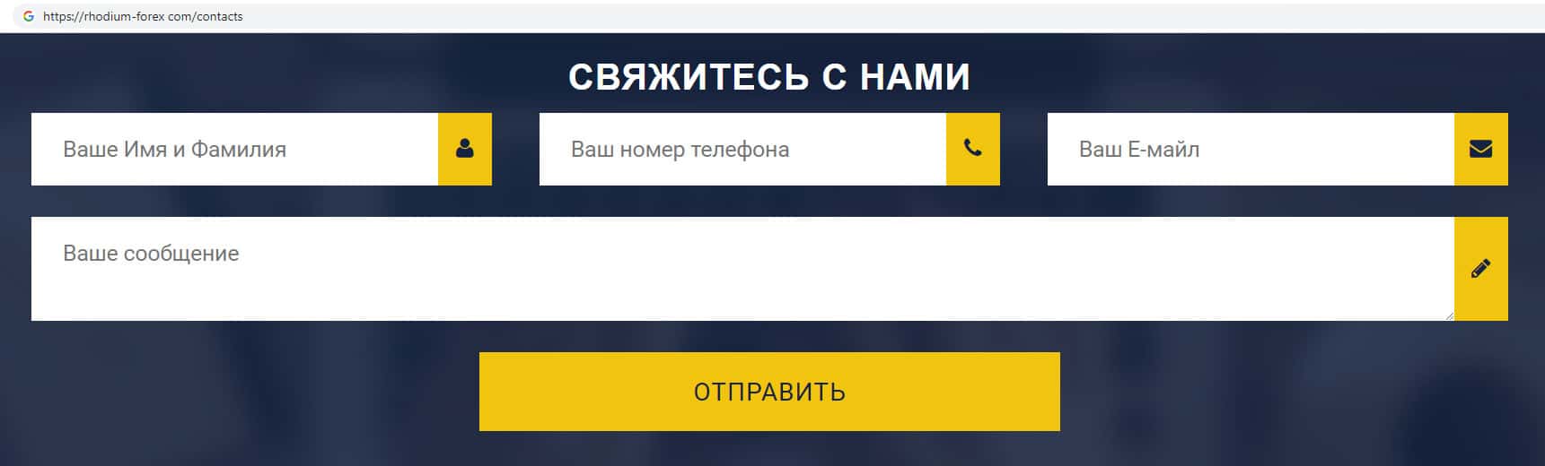 Шулера Рходиум Форекс предлагают пользователям заполнить бланк обратной связи, где просят указать свое имя, фамилию, адрес электронной почты и номер контактного телефона.