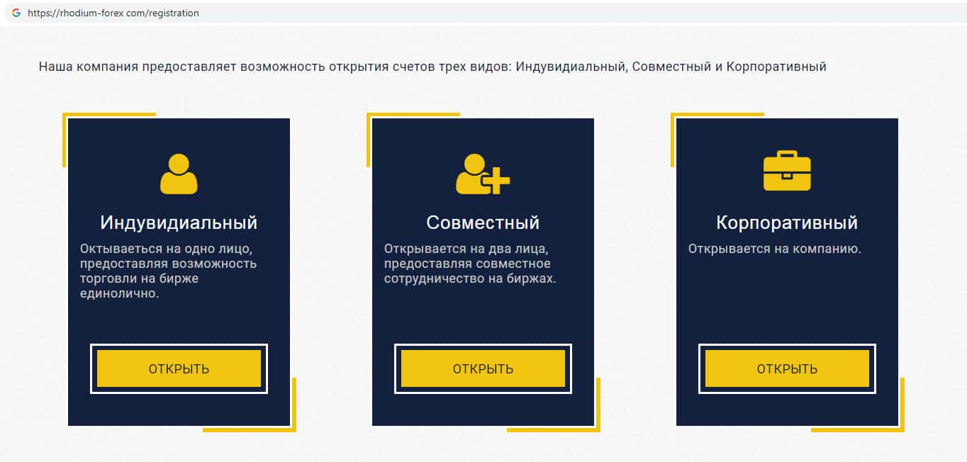 Шулера Rhodium Forex предлагают клиентам на выбор 3 типа торгового счета: Индивидуальный, Совместный и Корпоративный.