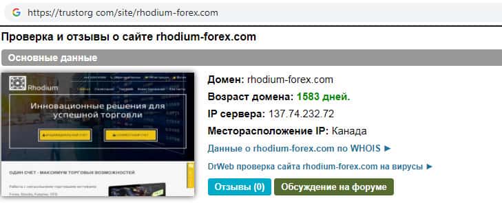 Проверка интернет-ресурса аферистов Rhodium Forex на trustorg com показала, что возраст домена к моменту написания статьи составляет 1583 дня, скорее всего домен купленный.