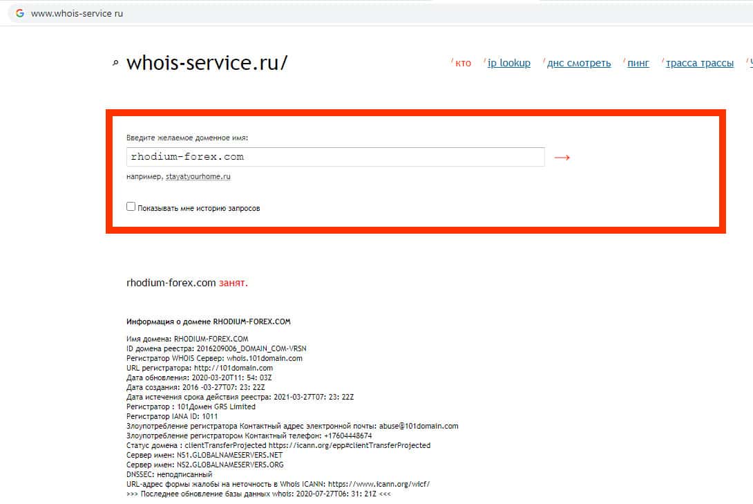 - Проверка возраста домена компании Рходиум Форекс
