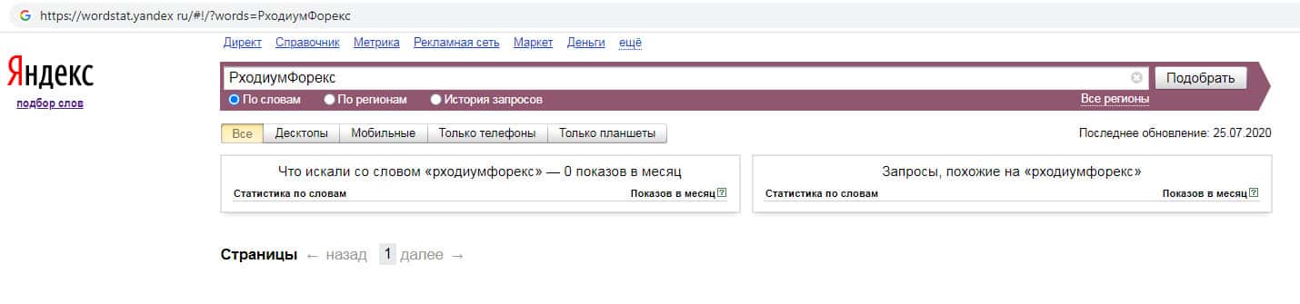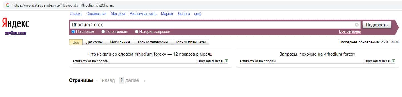 На wordstat yandex ru отсутствуют запросы по бренду англоязычного названия компании без пробела "RhodiumForex".