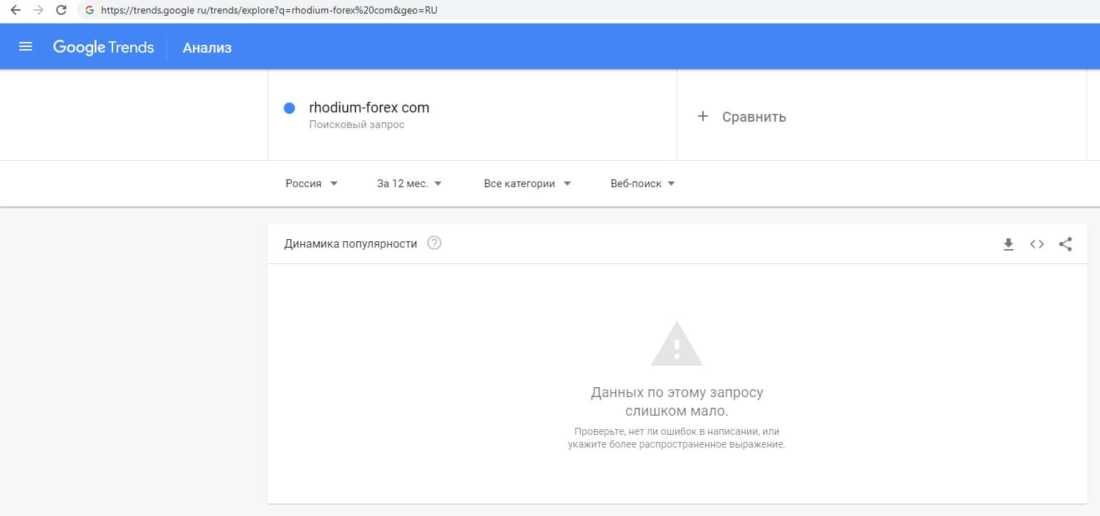 На Гугл Трендс также отсутствуют данные о количестве брендовых запросов названия домена без точки, а именно: "rhodium-forex com".