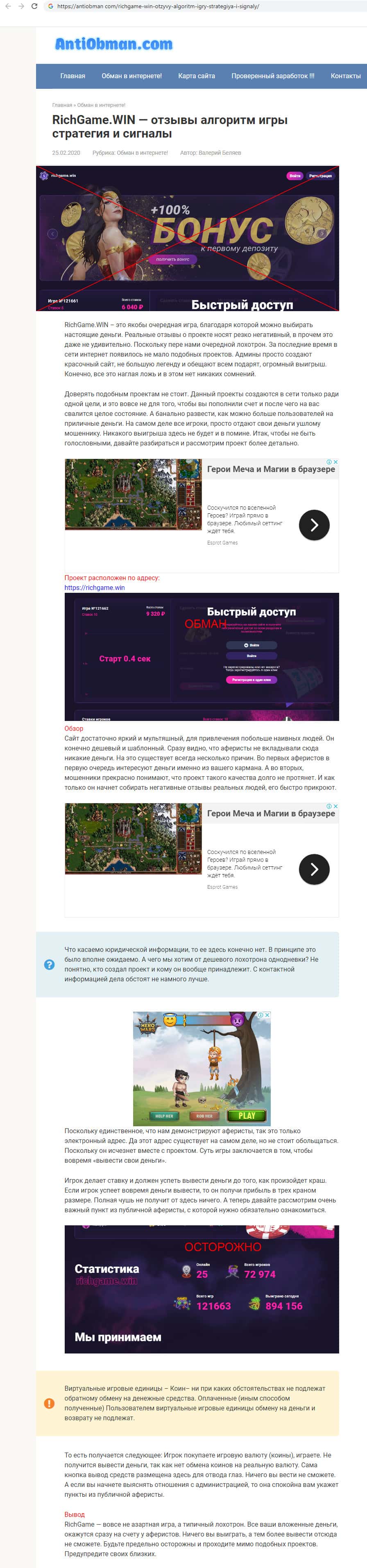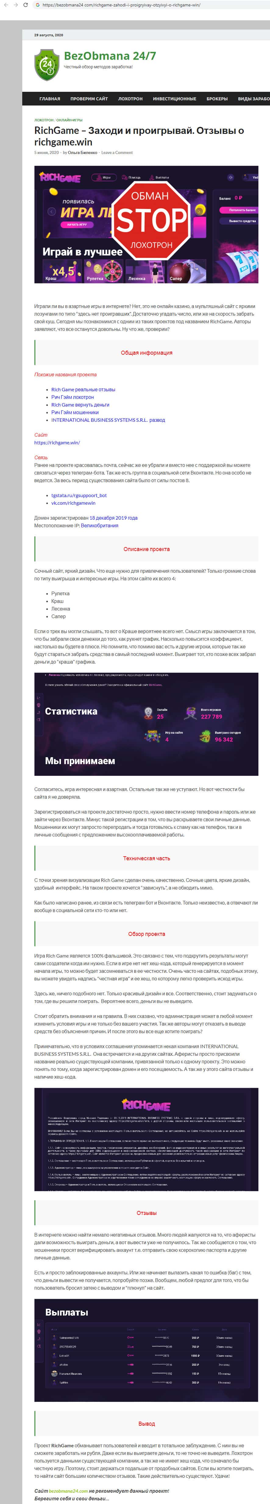 Сайт bezobmana24 com опубликовал своё мнение о фирме разводил RichGame Win. Интернет ресурс утверждает, что данный проект обманывает пользователей и вводит их в заблуждение.