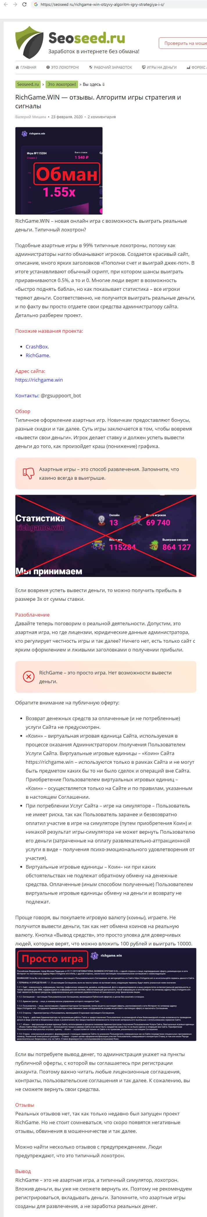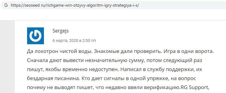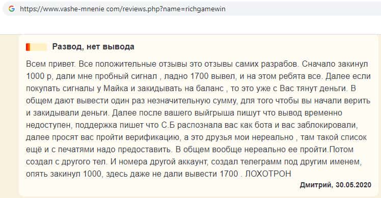 Так же мы обнаружили информацию о компании аферистов RichGame Win на сайте seoseed ru. Данный интернет ресурс утверждает, что компания является обычным лохотроном.