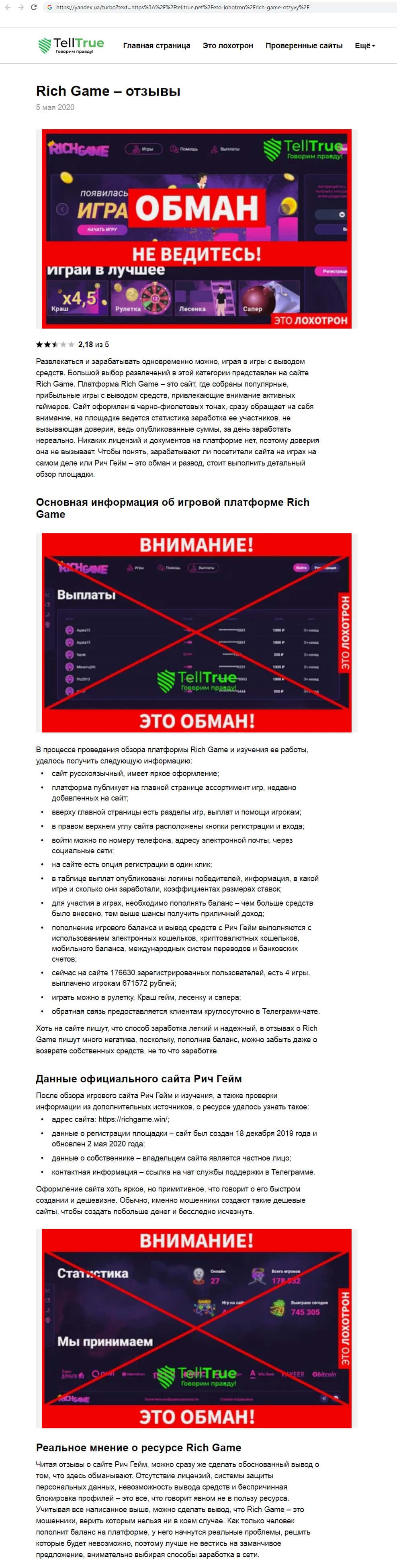 - Мнение интернет ресурсов о компании разводил Рич Гейм