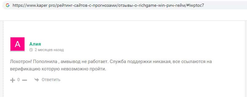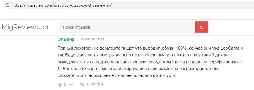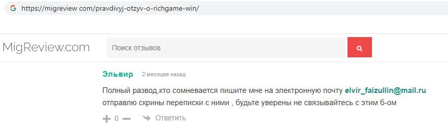 Махинаторы RichGame Win пишут положительные отзывы о себе