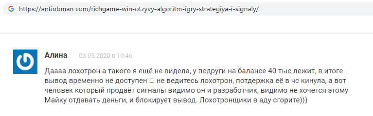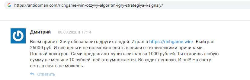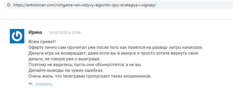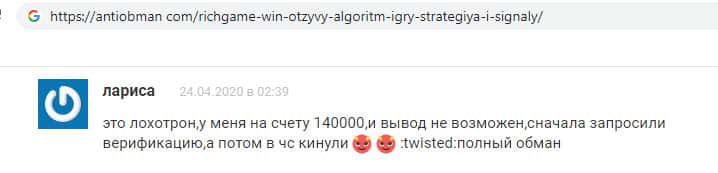 На интернет ресурсе antiobman com мы нашли информации о мошенниках Рич Гейм. Сайт утверждает, что данный проект это вовсе не игра, а полный лохотрон, который отбирает деньги клиентов.