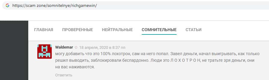 scam zone - сайт с отзывами о разводилах RichGame Win
