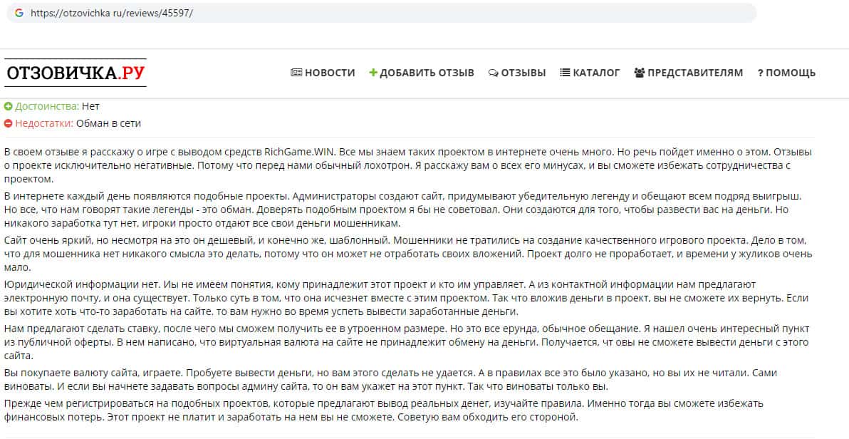 otzovichka ru - сайт с отзывами о лохотронщиках Рич Гейм