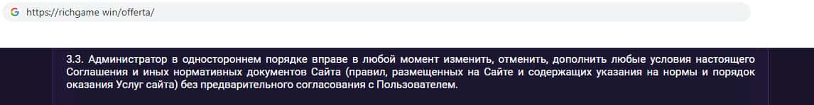 Так же аферисты Рич Гейм указали,что администрация сайта в любой момент может изменить данное соглашение и предоставляемые услуги без предварительного предупреждения.