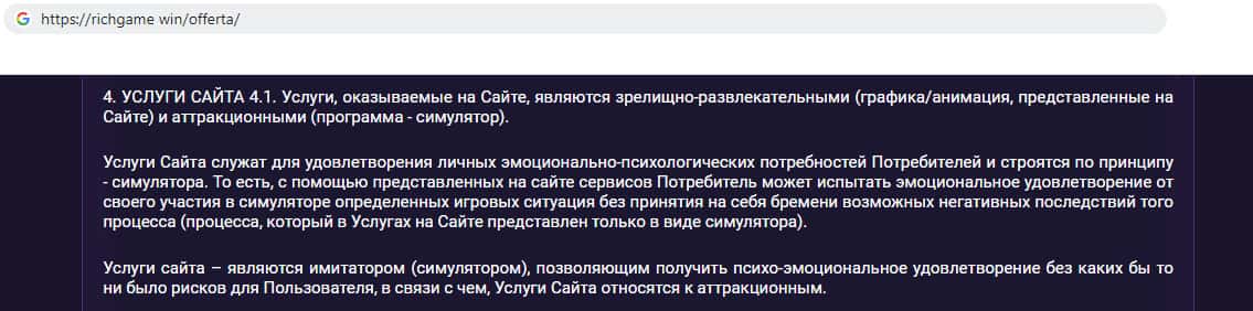 В одном из пунктов клиентского соглашения, мошенническая организация Рич Гейм указала, что сайт предоставляет исключительно развлекательные услуги.