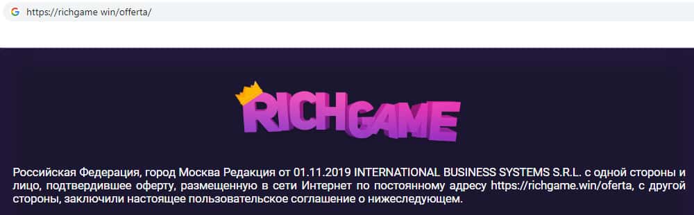 Мошенническая организация Рич Гейм на своём главном интернет ресурсе указала своё юридическое лицо, которым является компания INTERNATIONAL BUSINESS SYSTEMS S.R.L.