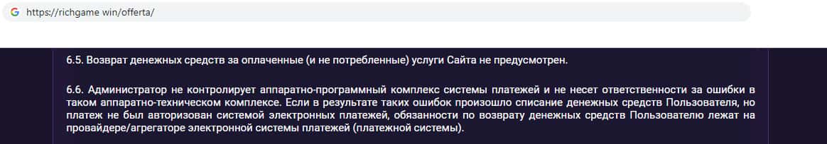В данном отзыве о фирме кидал Рич Гейм пользователь сообщил, что прочитал оферту компании, и понял, что жулики прямо написали, что не выводят средства с компании.