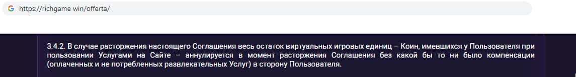 Кидалы Рич Гейм указали, что в случае расторжения контракта с клиентом, компания аннулирует все его средства, которые остались на счету.