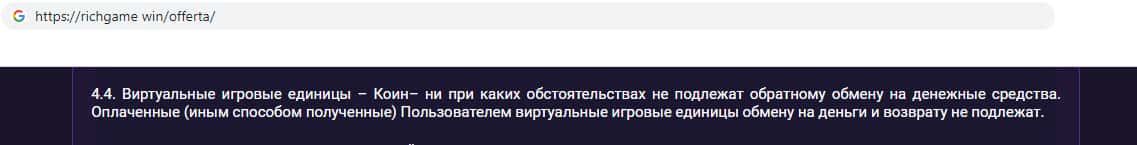 Так же разводилы указали, что игровая валюта, которую покупают клиенты компании Рич Гейм не подлежат никакому обмену на денежные средства.