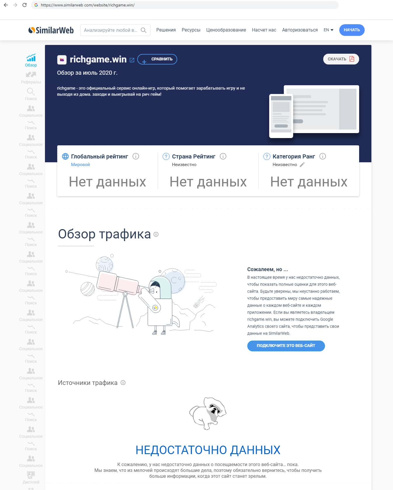 С помощью интернет ресурса similarweb com мы хотели узнать трафик сайта кидал Рич Гейм, но оказалось, что международный сервис не владеет информацией о трафике данного лохотрона.