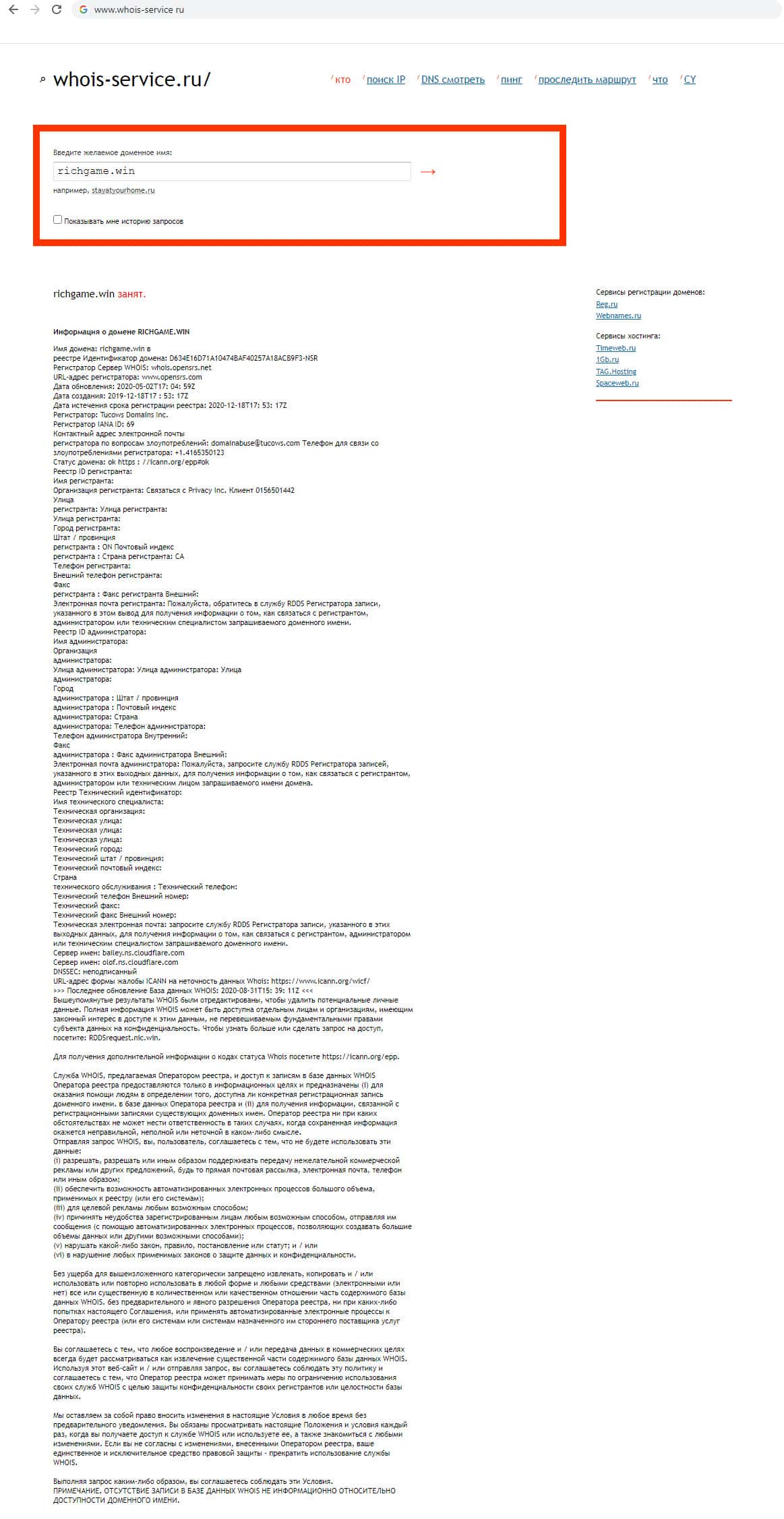 Для того что бы узнать владельца домена компании кидал Рич Гейм мы воспользовались сайтом whois-service ru, и оказалось, что жулики скрывают владельца домена.